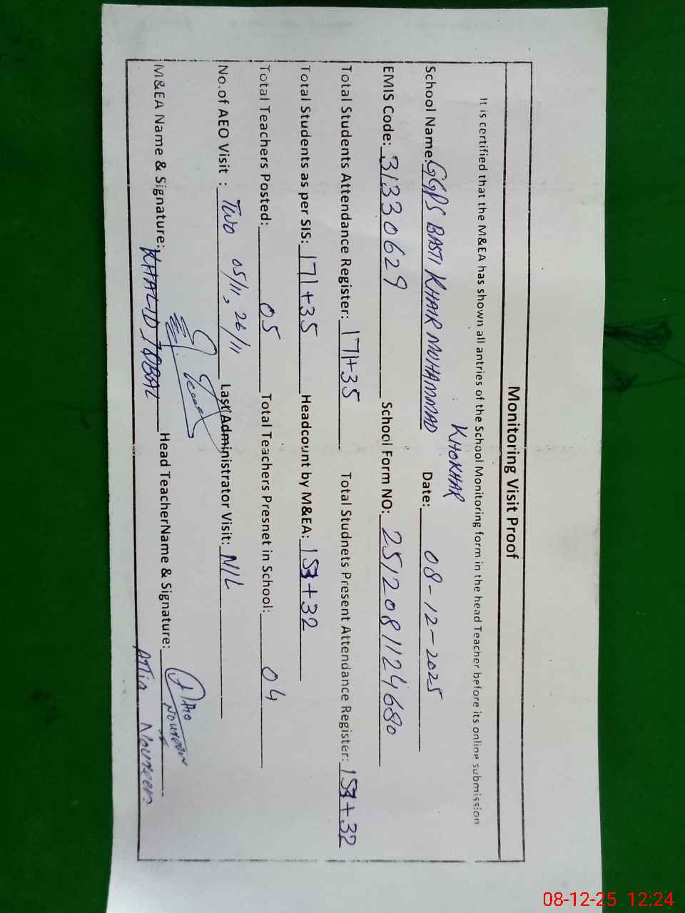| Attendance Register | Head Teacher | MEA with School | Visit Proof |