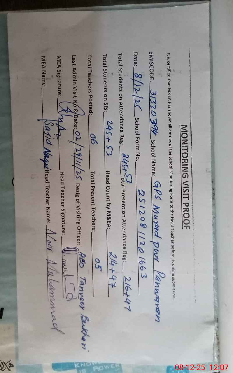 | EMIS Code: 31330394 | Name of School: GPS MURAD PUR PUNWARAN | |||