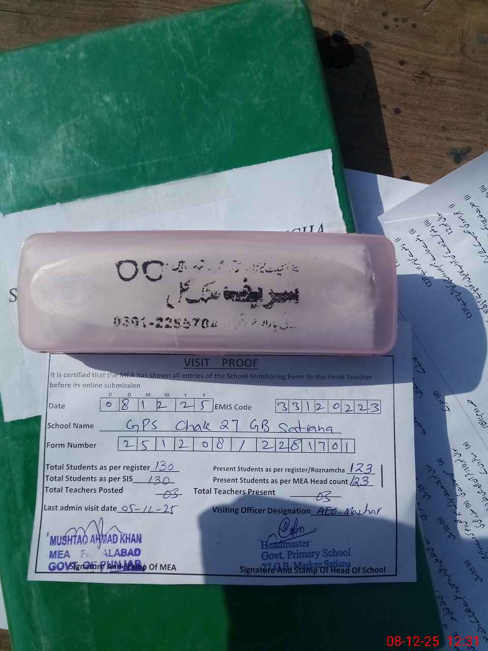 | Attendance Register | Head Teacher | MEA with School | Visit Proof |