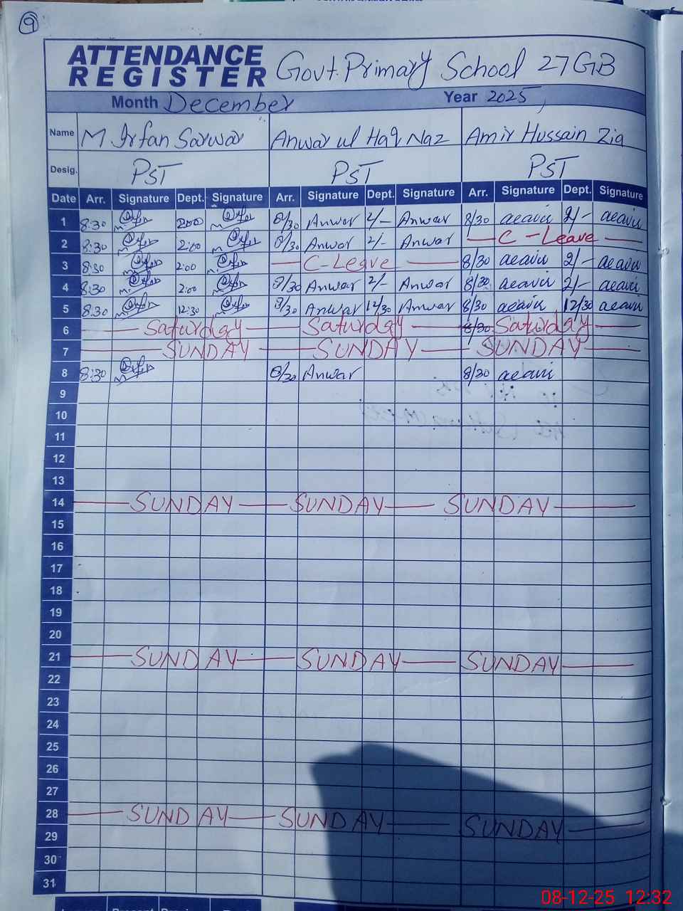 | CNIC | Full Name | Designation | R/C | Absence during last cal. month |