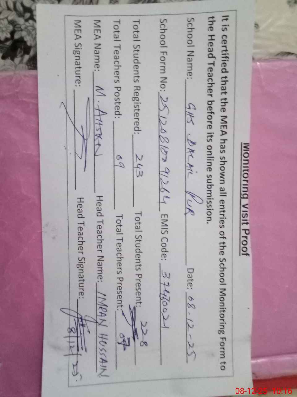 | Certified that this School was Inspected by the Undersigned MEA/DMO Today and the Information Stated Above is as Per Record. | |||||