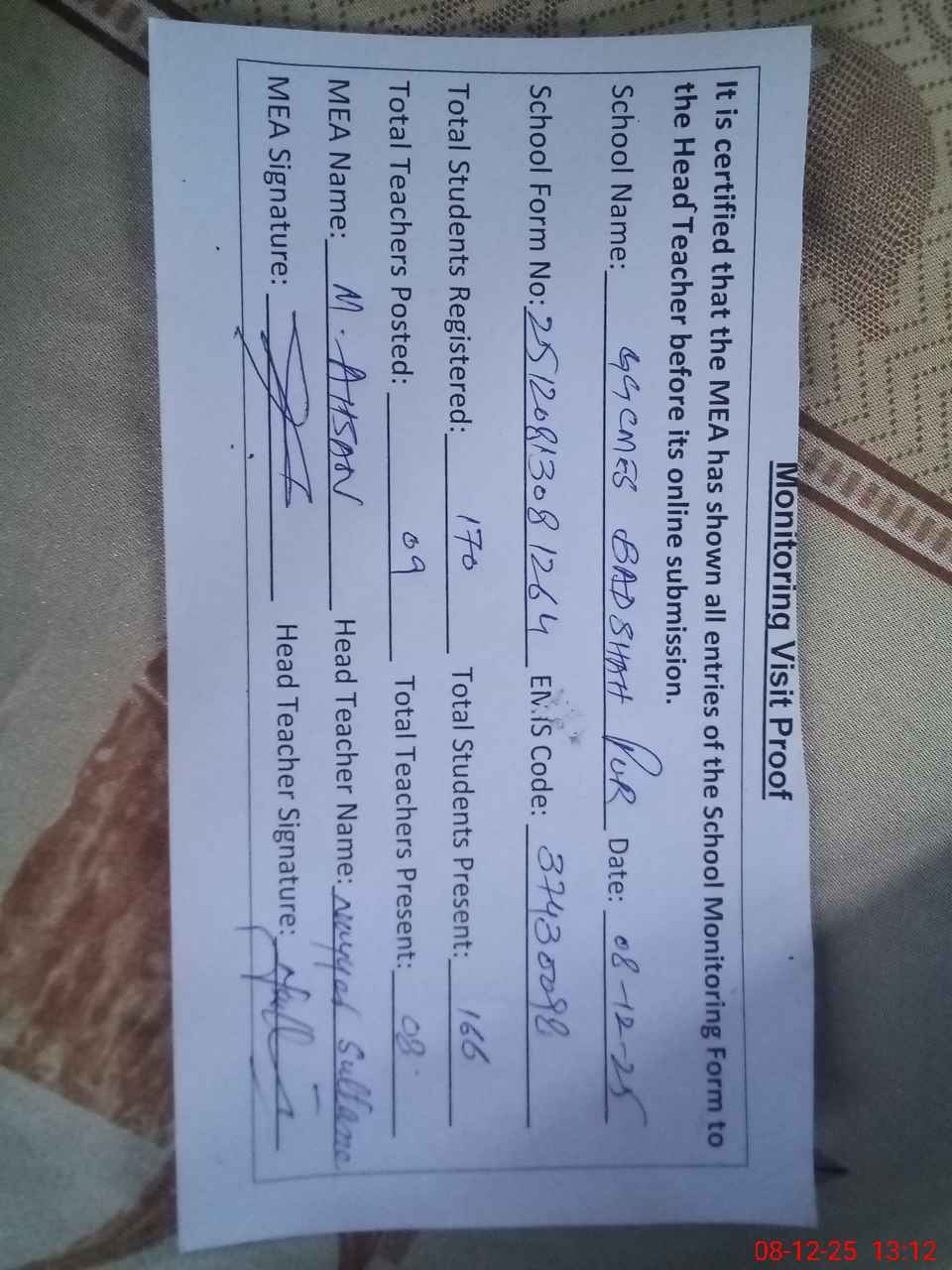| EMIS Code: 37430098 | Name of School: GGCMES BADSHAH PUR | |||