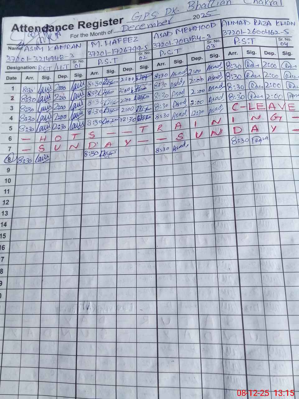 | CNIC | Full Name | Designation | R/C | Absence During Last Calender Month |