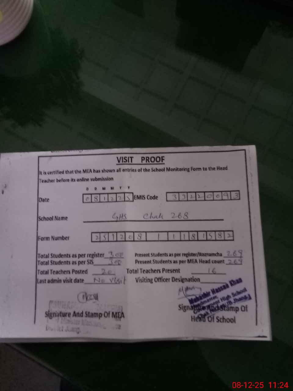 | Attendance Register | Head Teacher | MEA with School | Visit Proof |