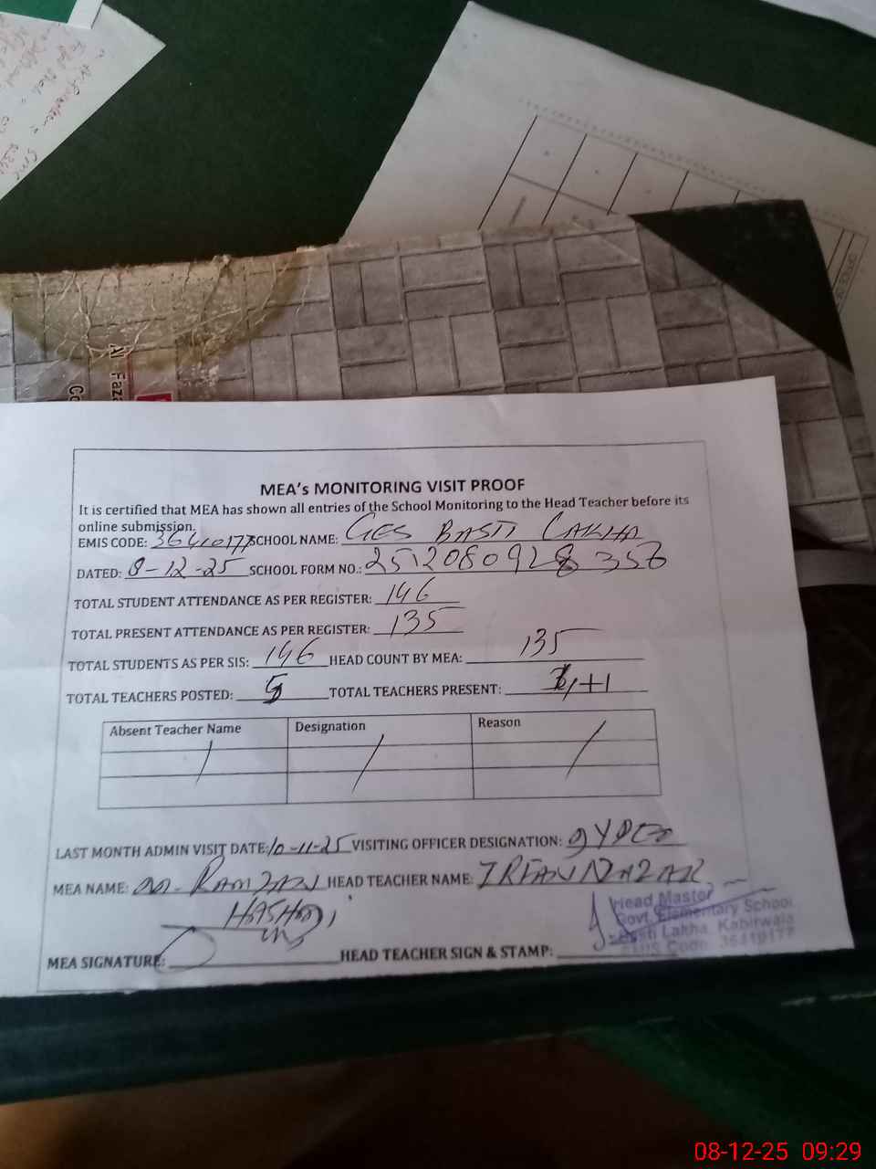 | Attendance Register | Head Teacher | MEA with School | Visit Proof |