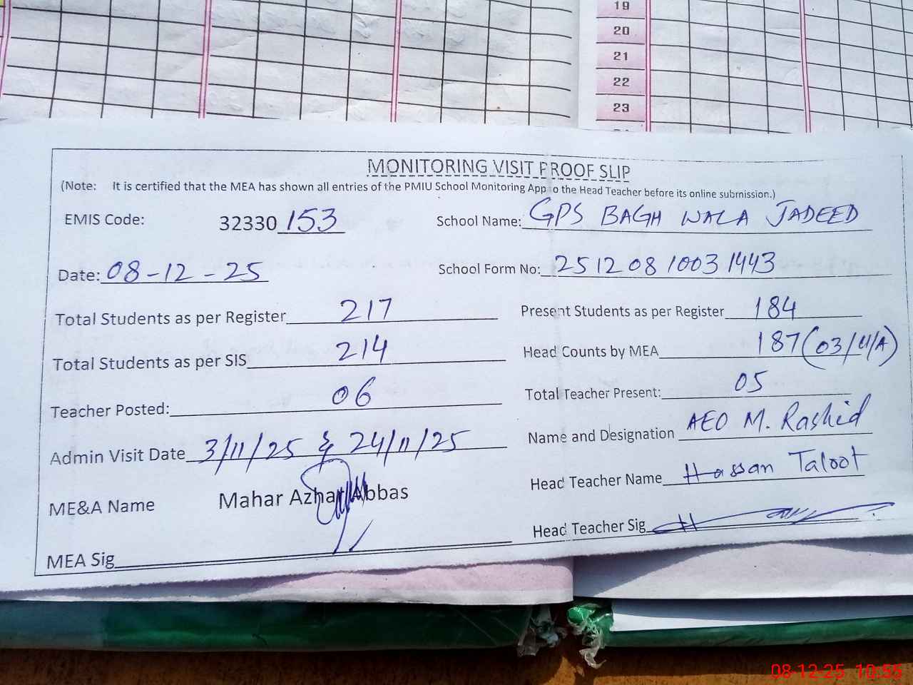 | Attendance Register | Head Teacher | MEA with School | Visit Proof |