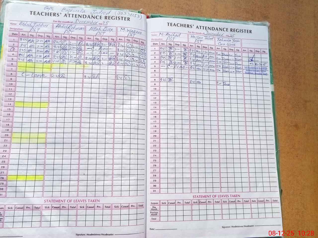 | CNIC | Full Name | Designation | R/C | Absence During Last Calender Month |