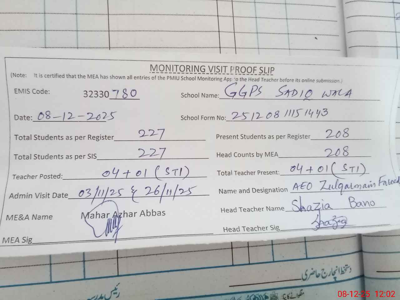 | EMIS Code: 32330780 | Name of School: GGPS SADIQ WALA | |||