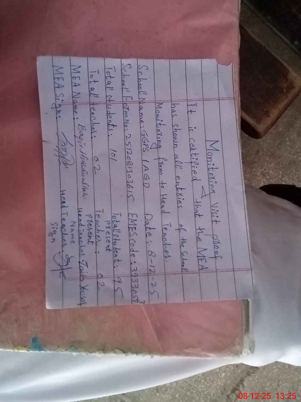 | Attendance Register | Head Teacher | MEA with School | Visit Proof |