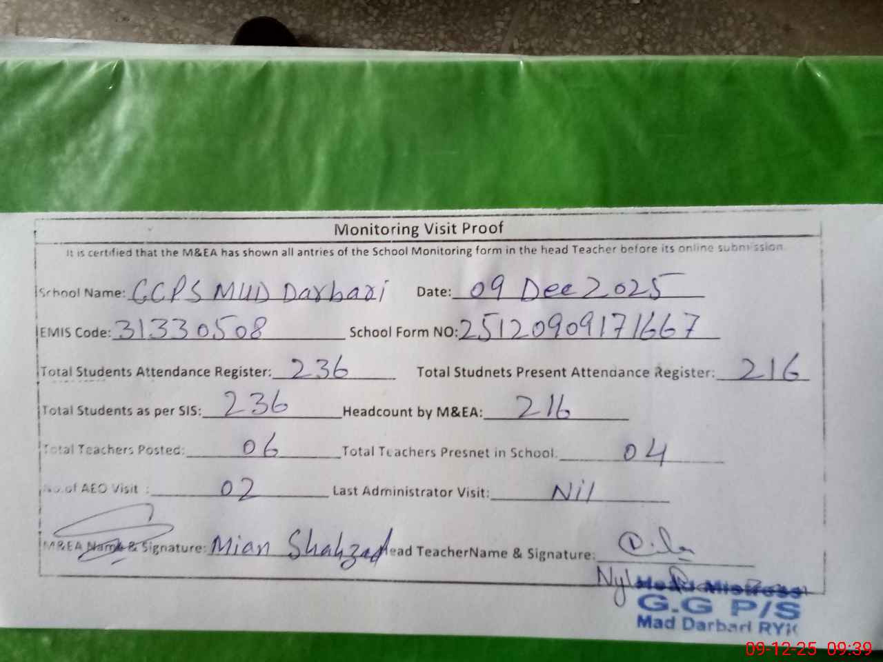 | Attendance Register | Head Teacher | MEA with School | Visit Proof |