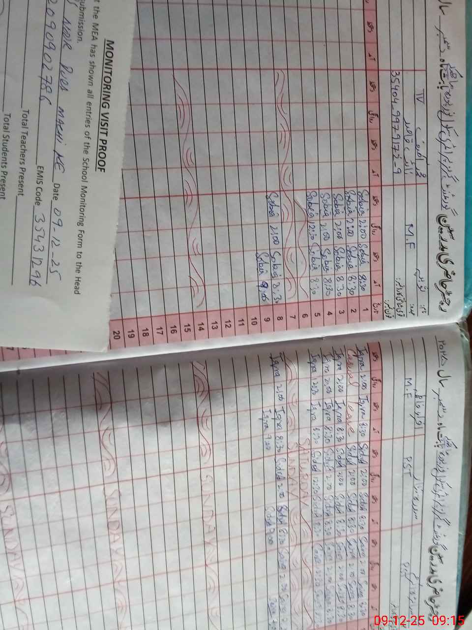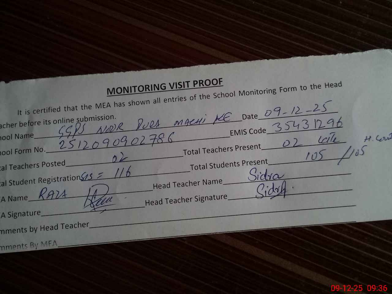 | Attendance Register | Head Teacher | MEA with School | Visit Proof |