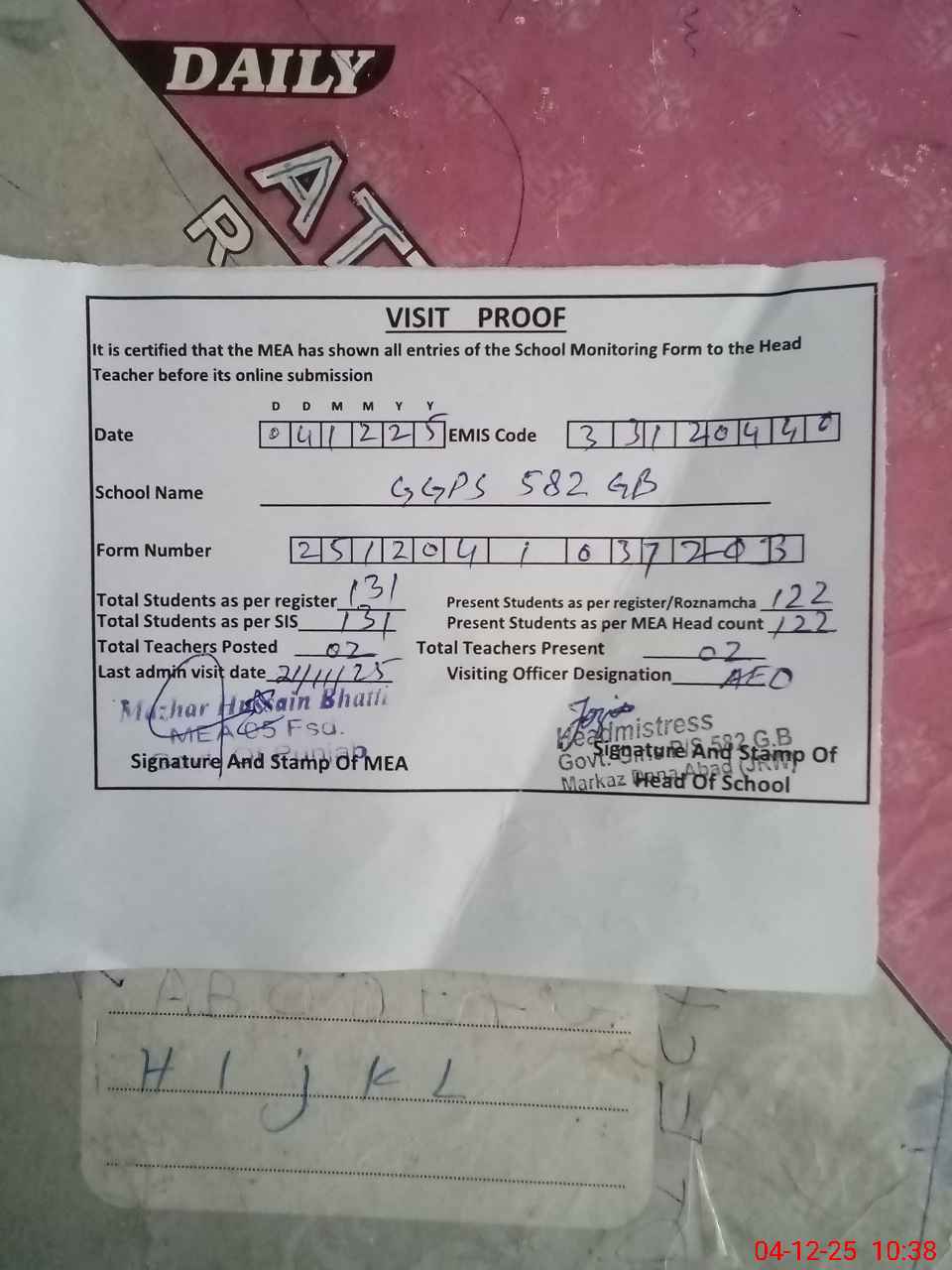 | EMIS Code: 33120440 | Name of School: GGPS 582 GB | |||