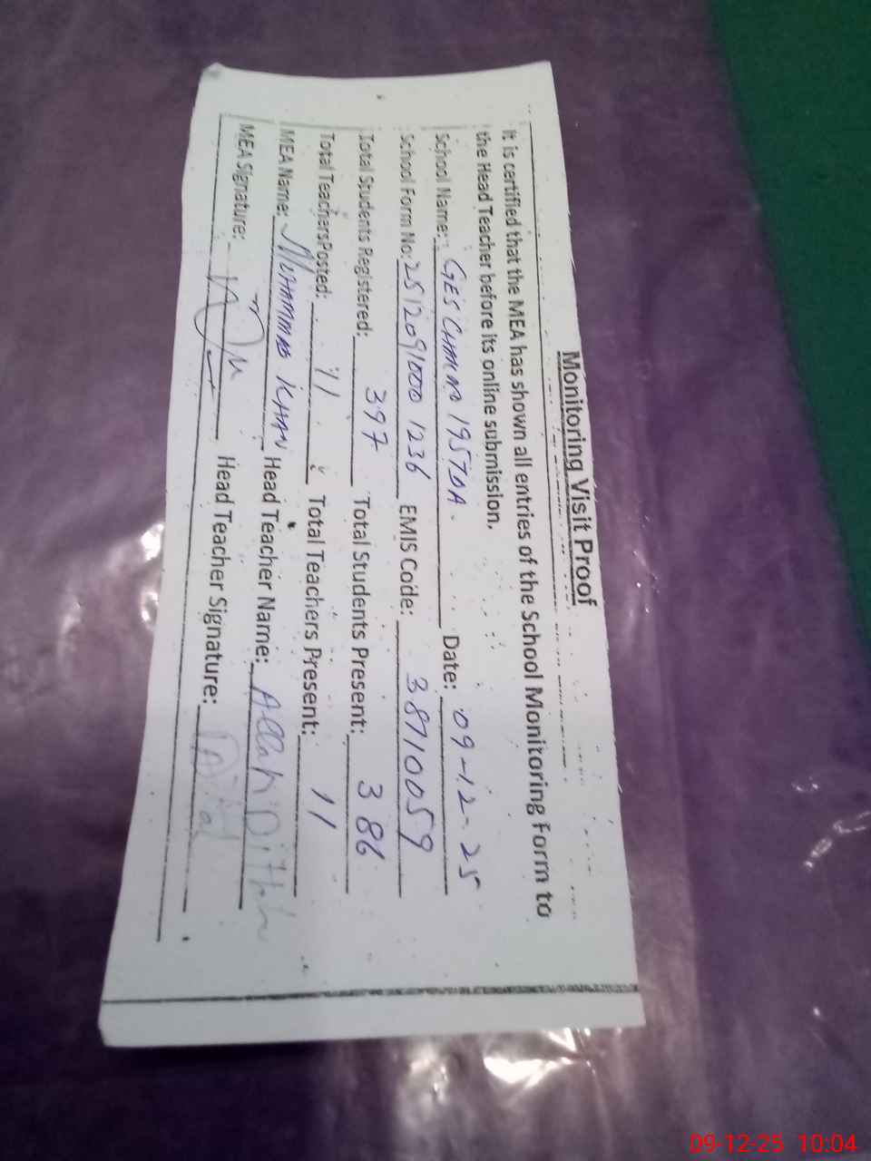 | Attendance Register | Head Teacher | MEA with School | Visit Proof |