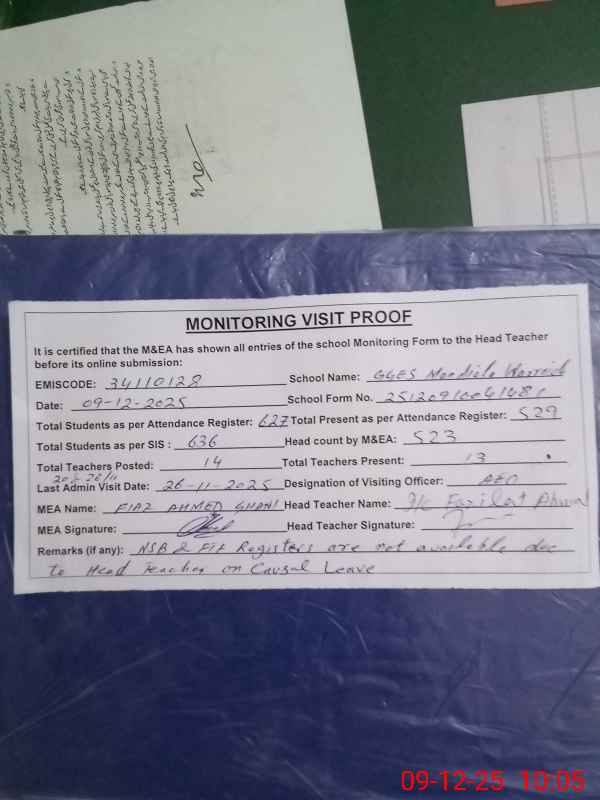 | Remarks (Use Separate Page if Required): Attendance of teaching staff and students on SIS Software is not updated NSB and FTF Record Registers are not available due to Head Teacher on Causal Leave Data as per provided by School Staff and found during physical visit | |||||
