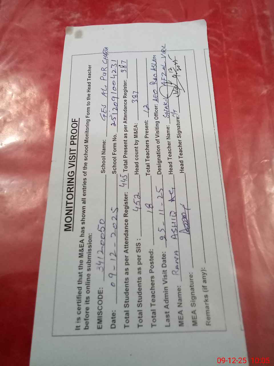 | Attendance Register | Head Teacher | MEA with School | Visit Proof |
