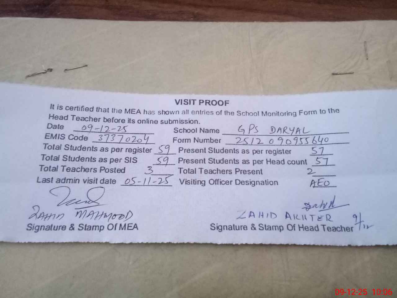 | Attendance Register | Head Teacher | MEA with School | Visit Proof |