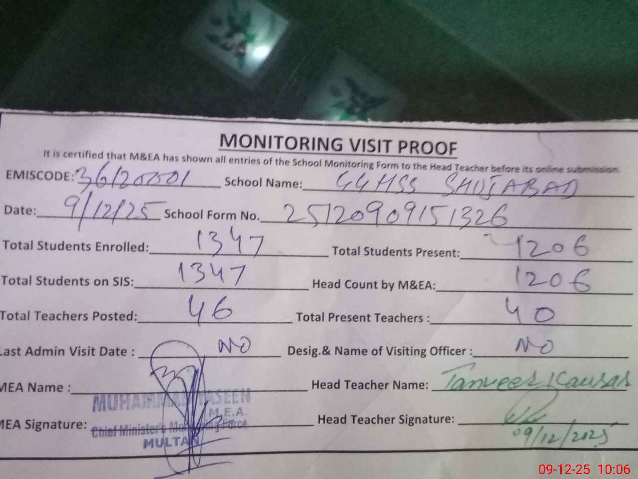| EMIS Code: 36120001 | Name of School: GGHSS SHUJABAD MULTAN | |||