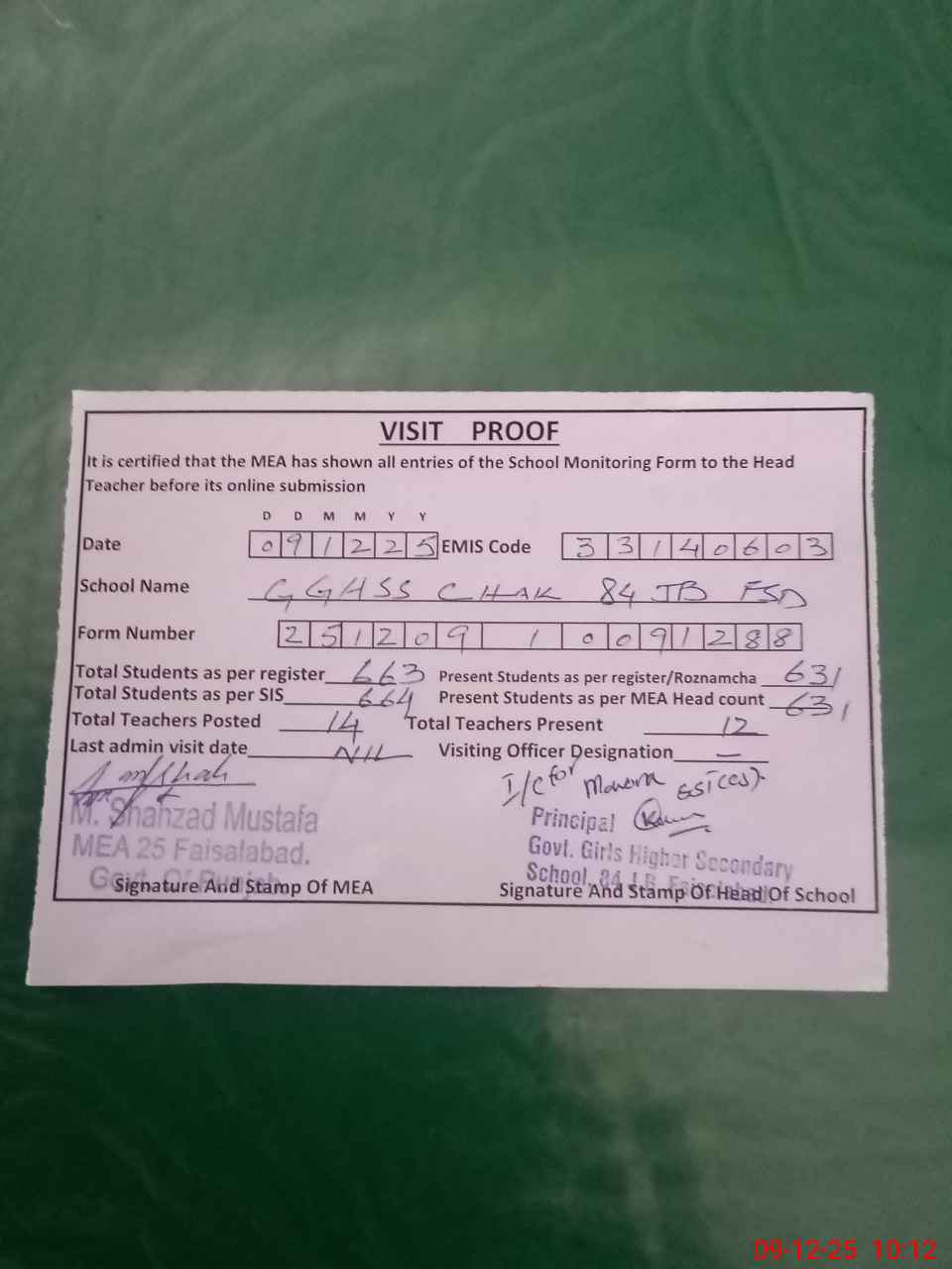 | Attendance Register | Head Teacher | MEA with School | Visit Proof |