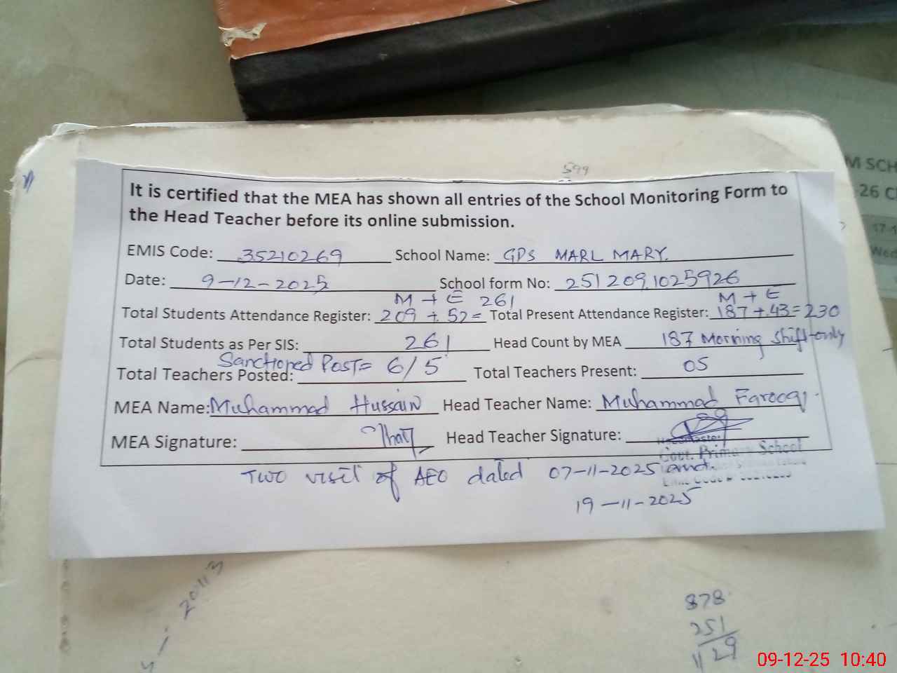 | Attendance Register | Head Teacher | MEA with School | Visit Proof |
