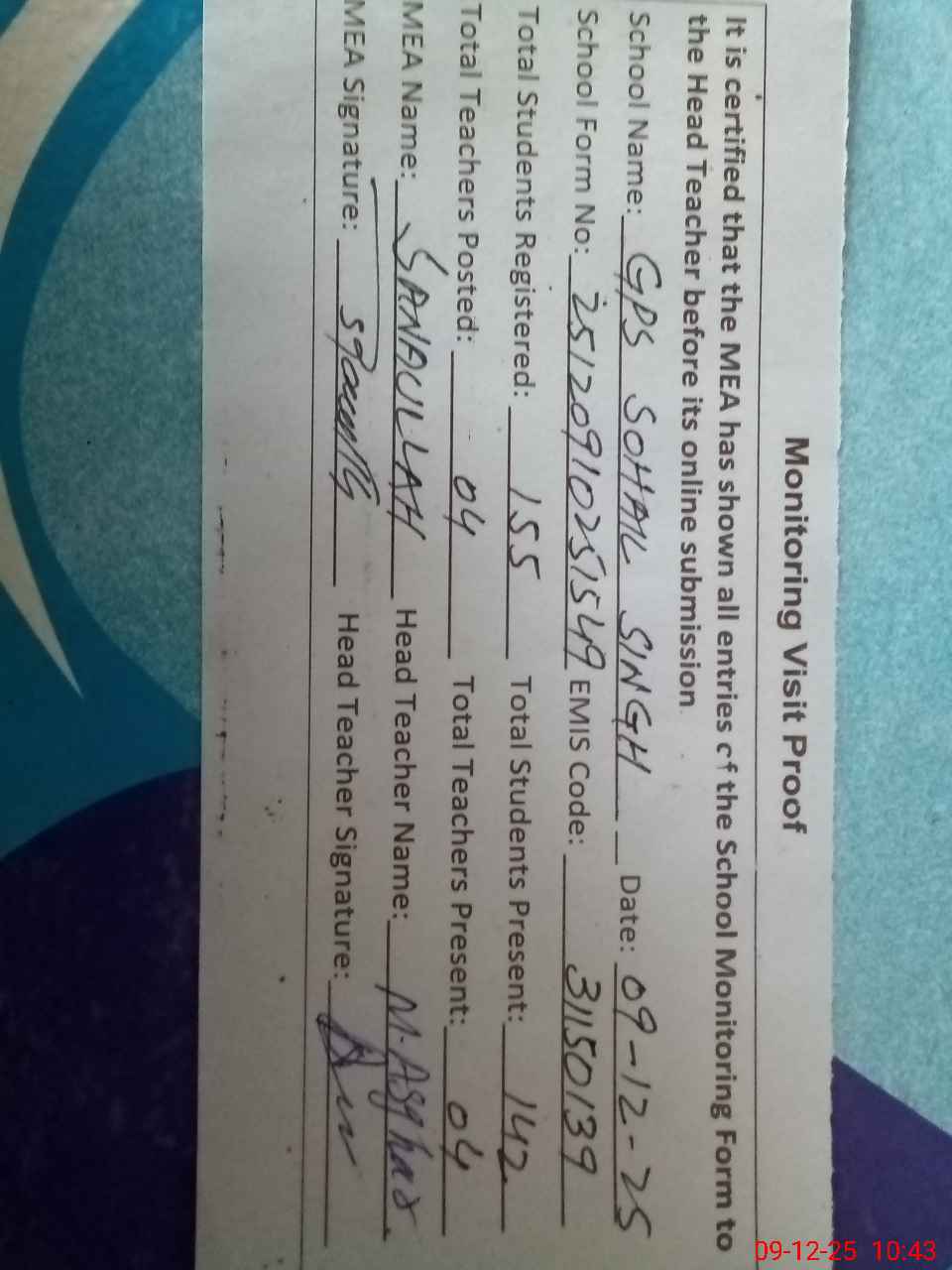 | Attendance Register | Head Teacher | MEA with School | Visit Proof |