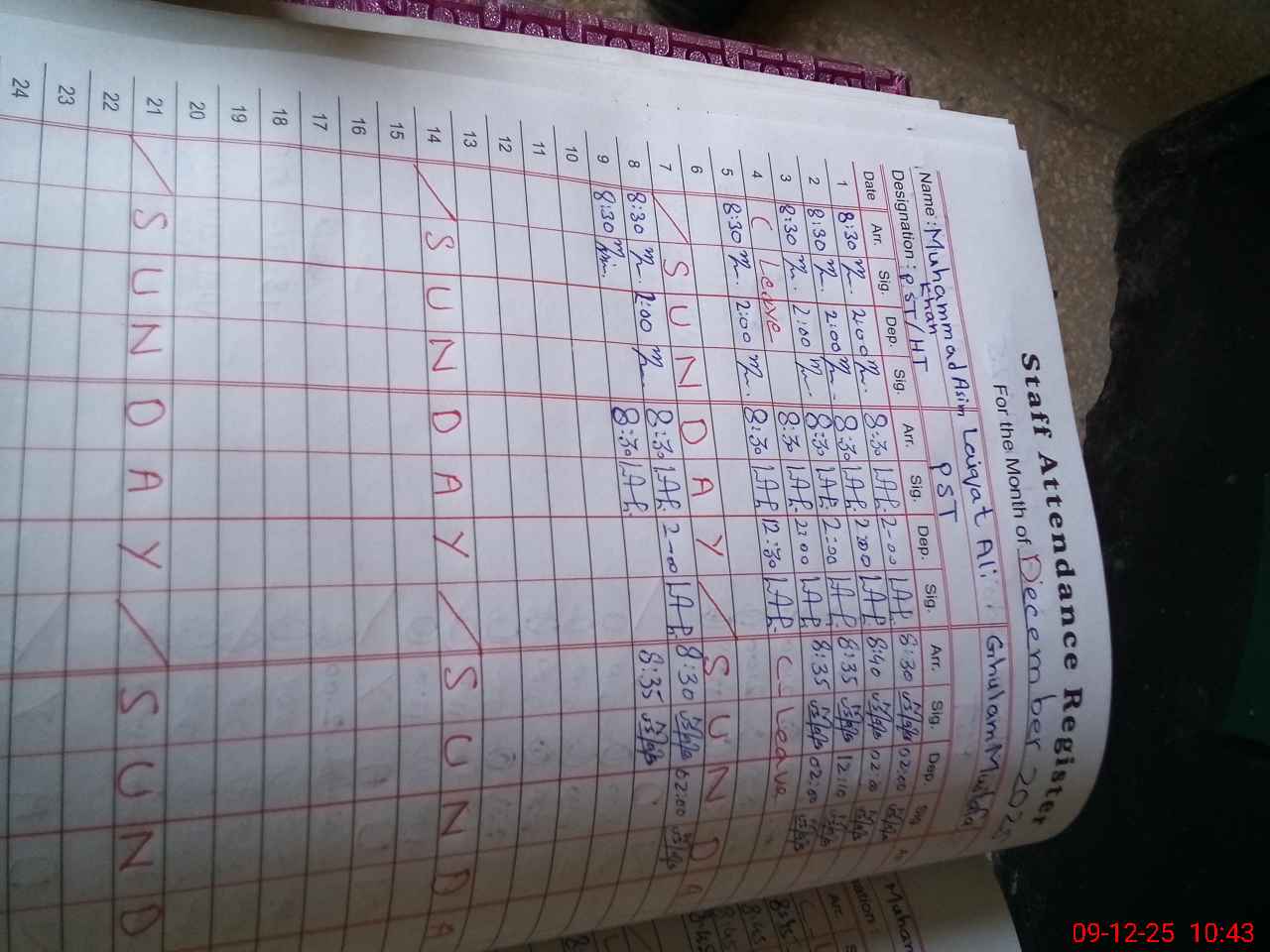 | CNIC | Full Name | Designation | R/C | Absence During Last Calender Month |