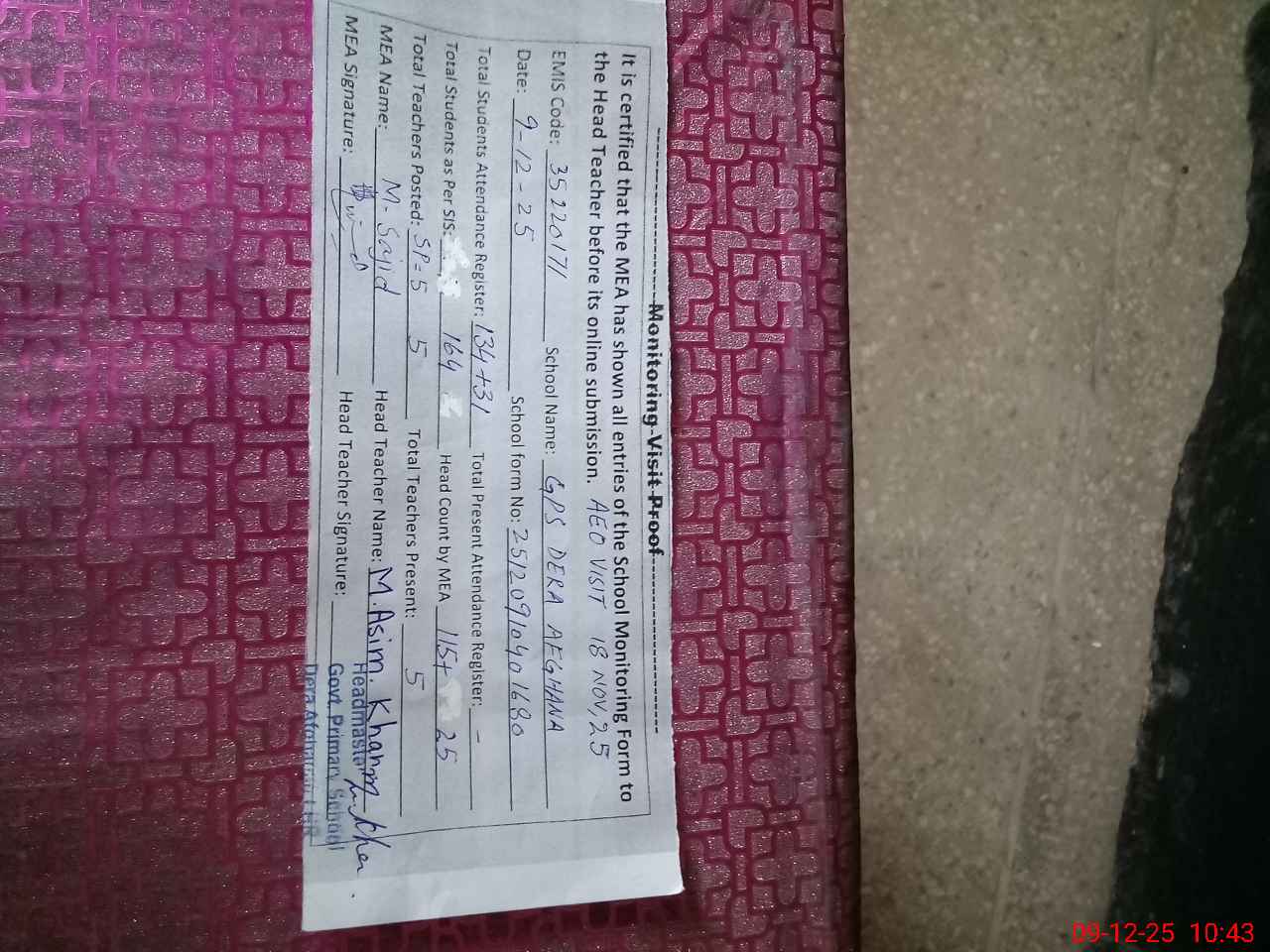 | Attendance Register | Head Teacher | MEA with School | Visit Proof |