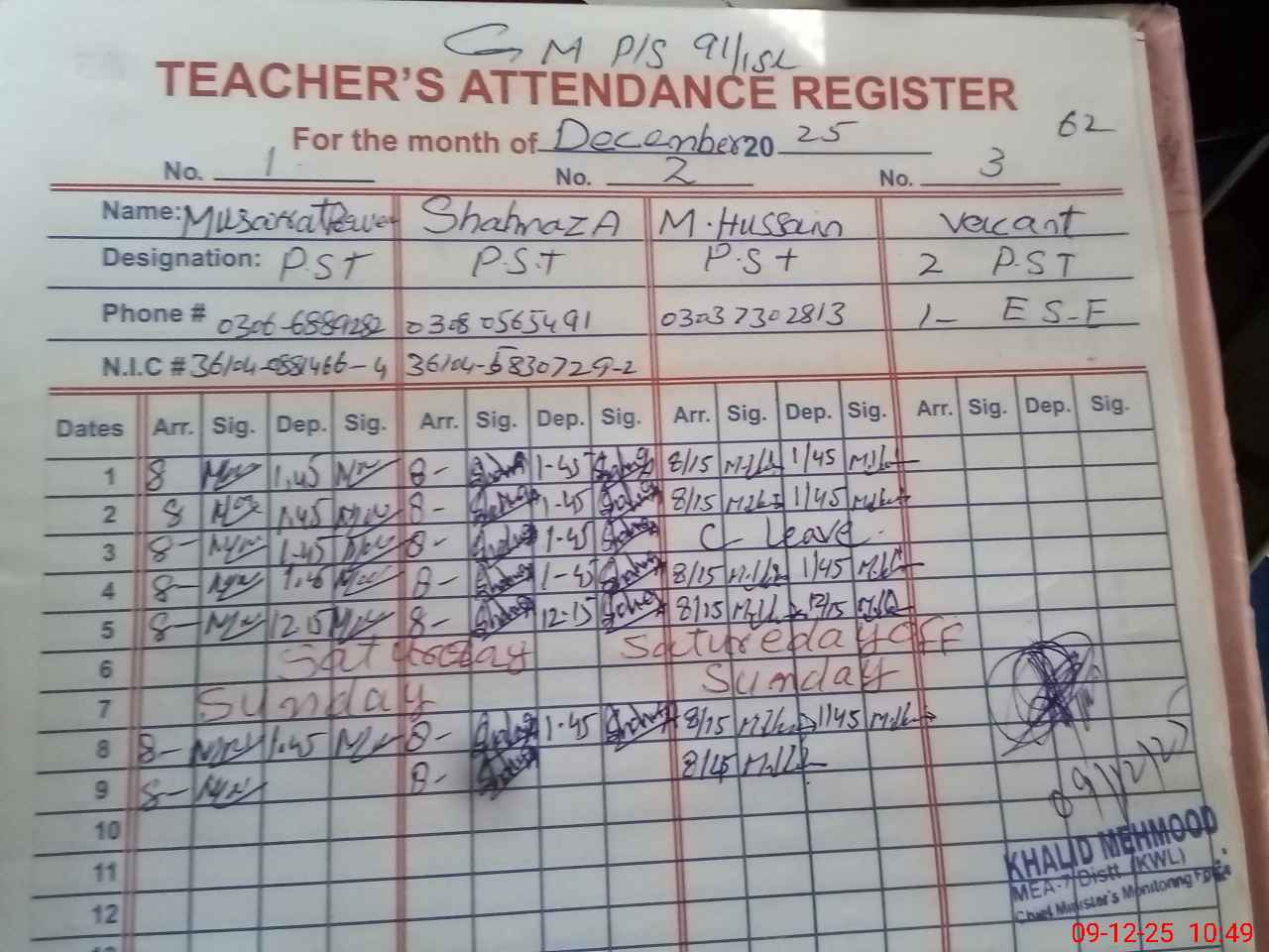 | Name: MU**** PA**** Designation: (School Headmaster's/Headmistress's) PST Phone/Cell Number: 03**** |
