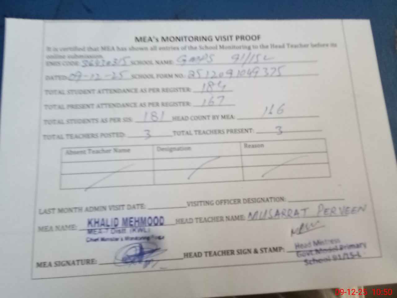 | Attendance Register | Head Teacher | MEA with School | Visit Proof |