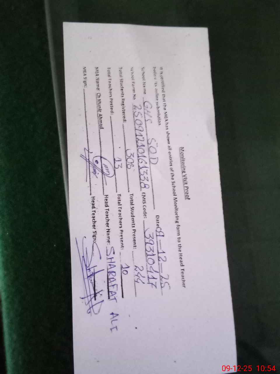 | Attendance Register | Head Teacher | MEA with School | Visit Proof |