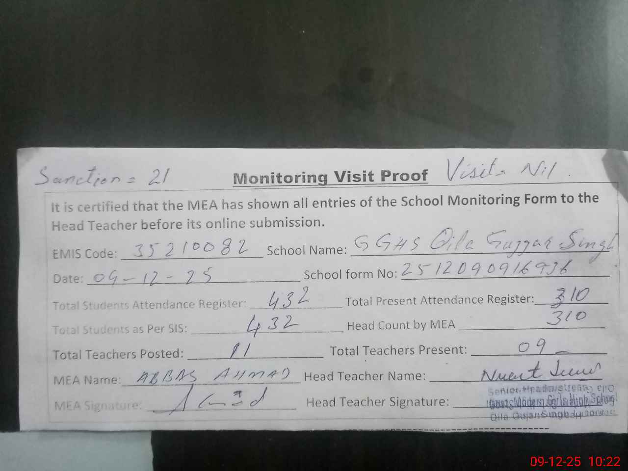 | EMIS Code: 35210082 | Name of School: GGHS MODERN QILA GUJAR SINGH | |||