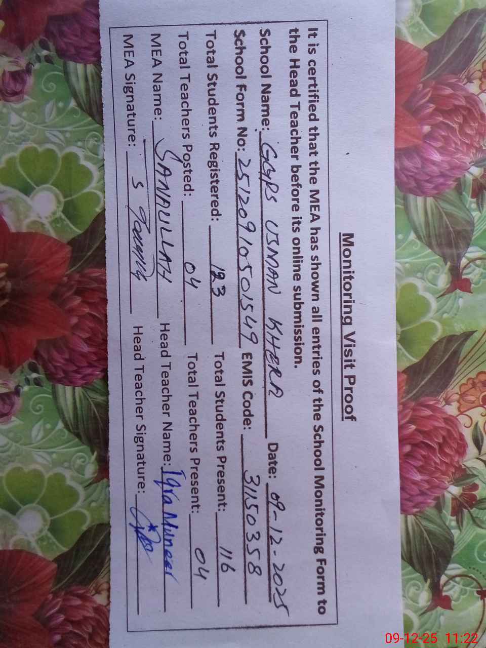 | EMIS Code: 31150358 | Name of School: GGPS USMAN KHARA | |||