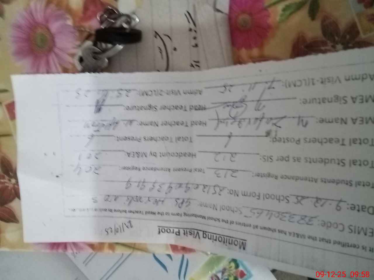 | Attendance Register | Head Teacher | MEA with School | Visit Proof |