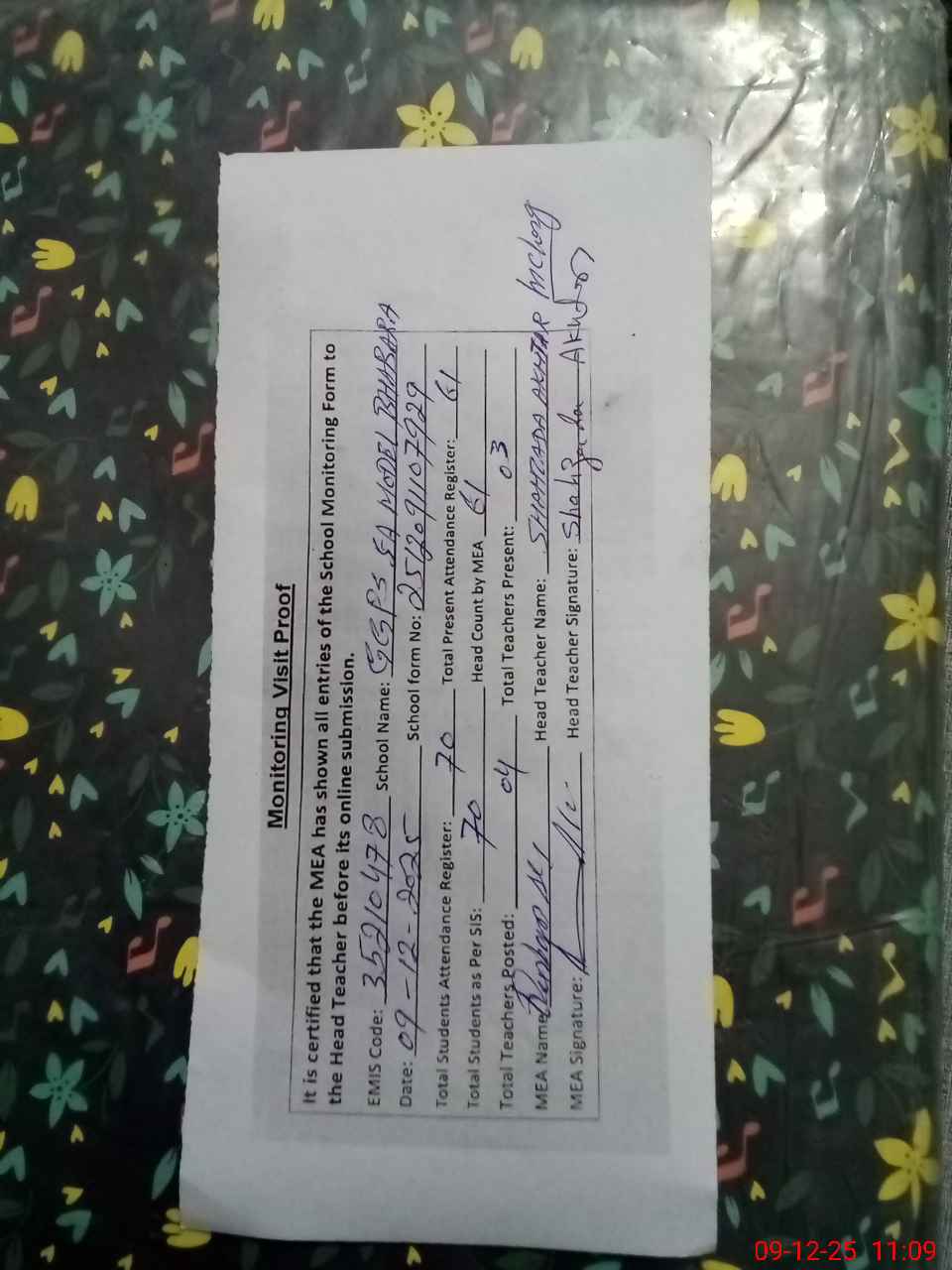 | Attendance Register | Head Teacher | MEA with School | Visit Proof |