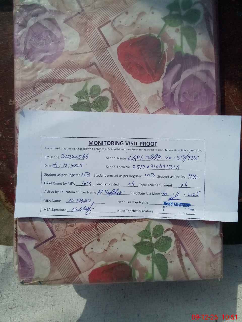 | Attendance Register | Head Teacher | MEA with School | Visit Proof |