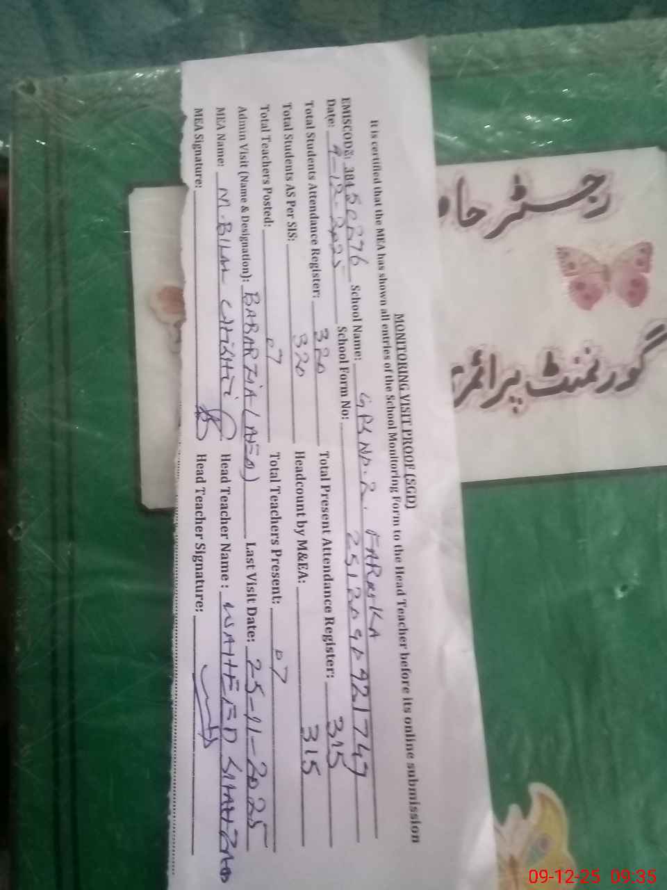 | Attendance Register | Head Teacher | MEA with School | Visit Proof |