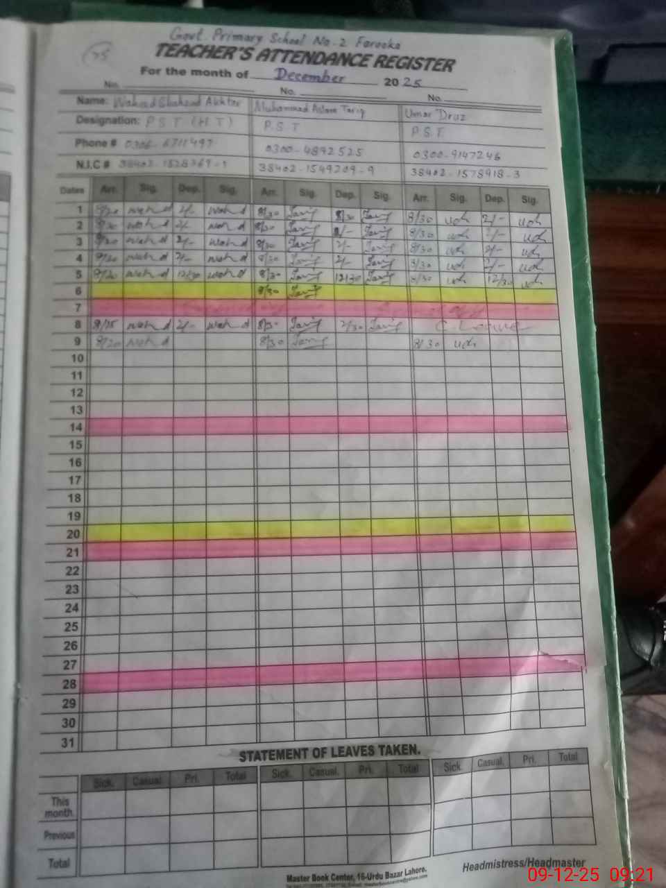 | CNIC | Full Name | Designation | R/C | Absence During Last Calender Month |