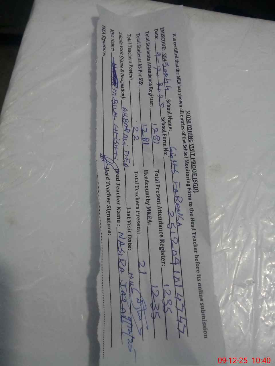| Attendance Register | Head Teacher | MEA with School | Visit Proof |