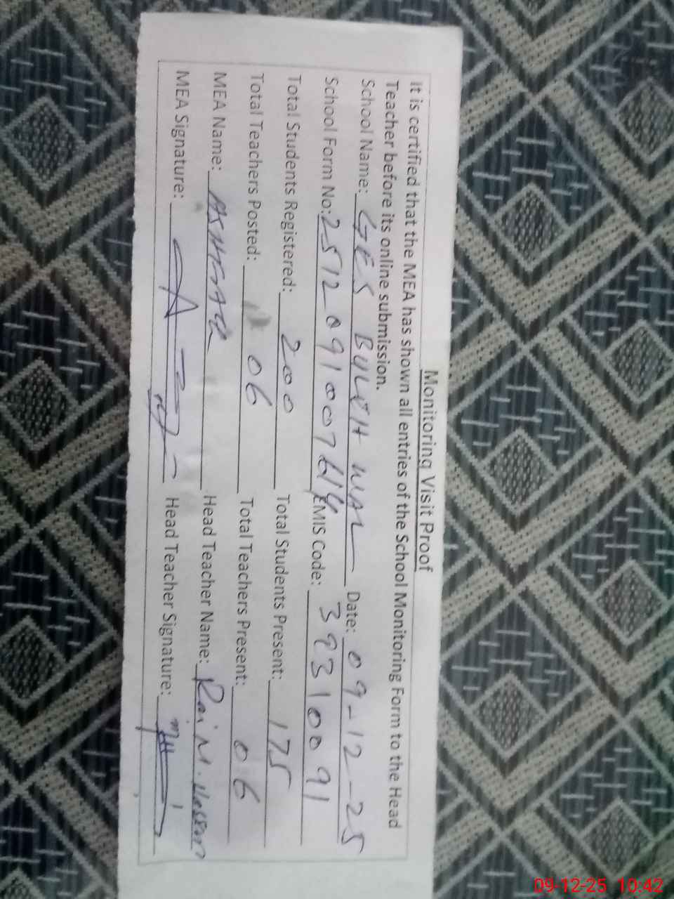 | Attendance Register | Head Teacher | MEA with School | Visit Proof |