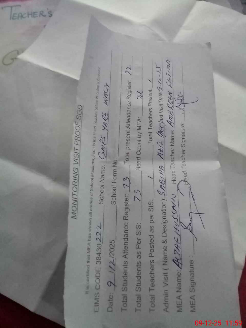 | Attendance Register | Head Teacher | MEA with School | Visit Proof |