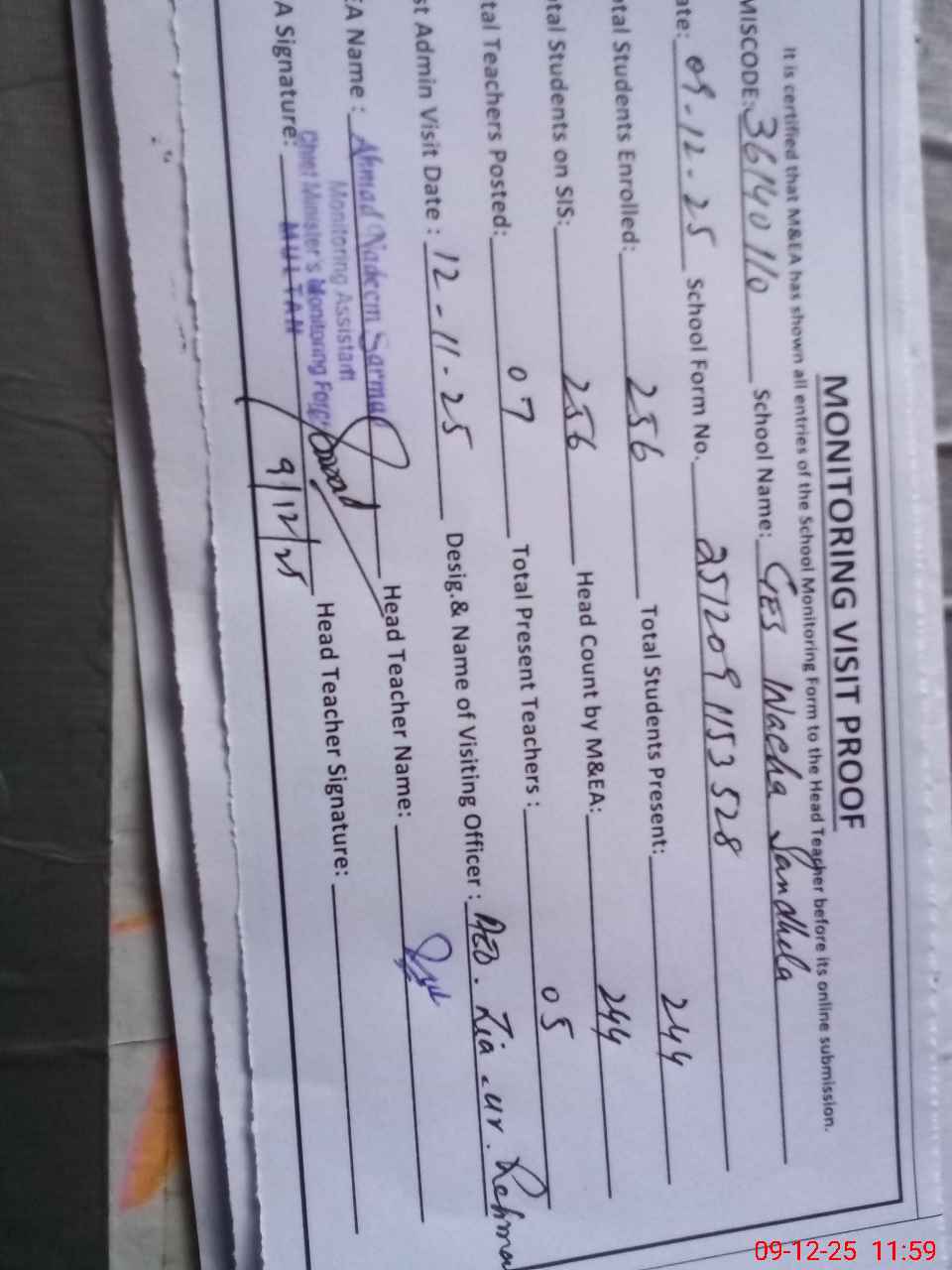 | Certified that this School was Inspected by the Undersigned MEA/DMO Today and the Information Stated Above is as Per Record. | |||||