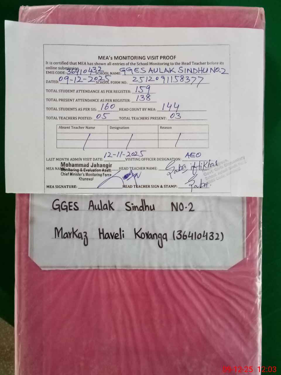 | Attendance Register | Head Teacher | MEA with School | Visit Proof |