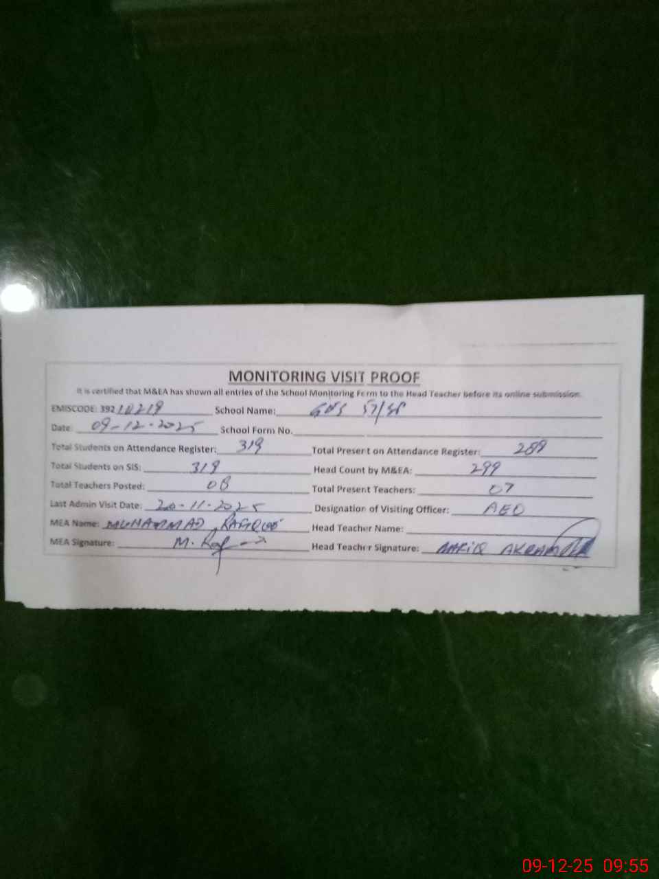 | Attendance Register | Head Teacher | MEA with School | Visit Proof |