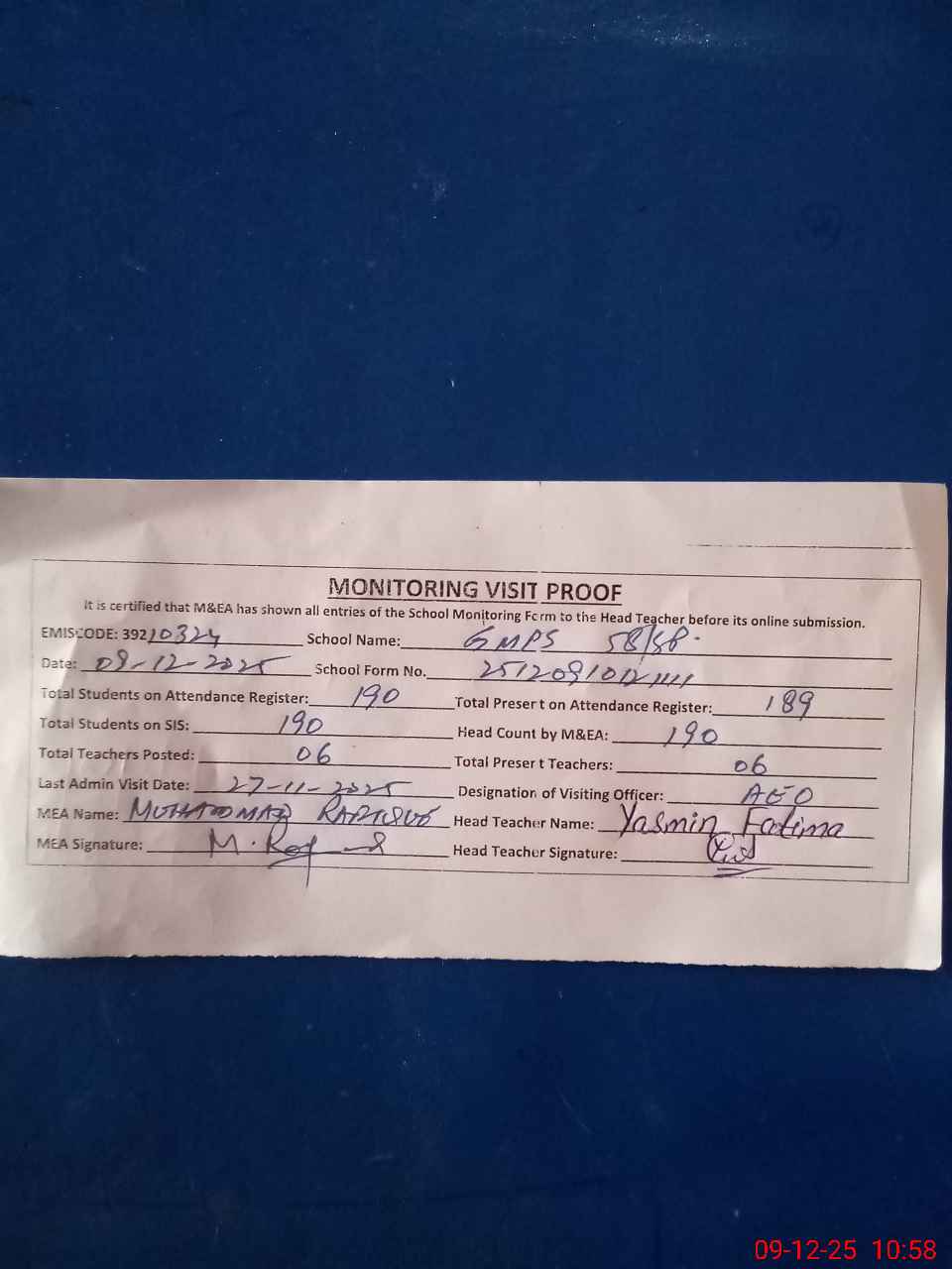 | Attendance Register | Head Teacher | MEA with School | Visit Proof |