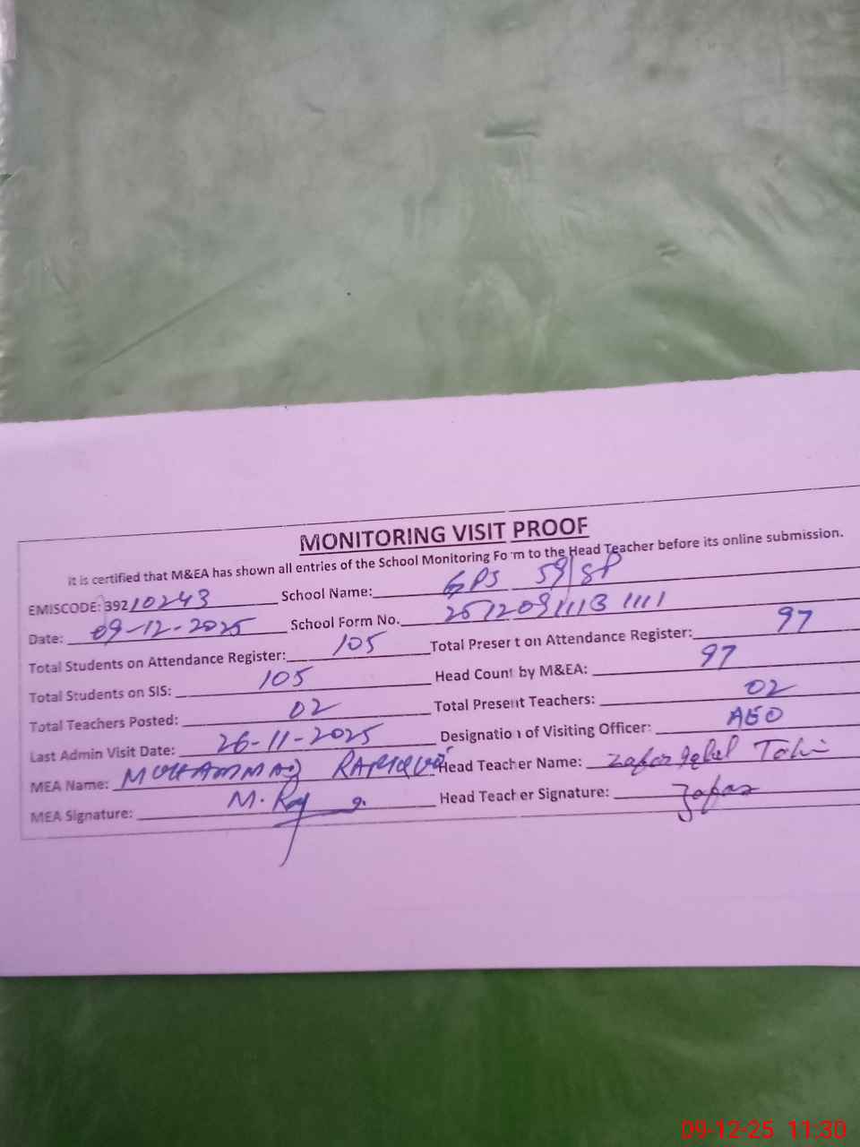 | Attendance Register | Head Teacher | MEA with School | Visit Proof |