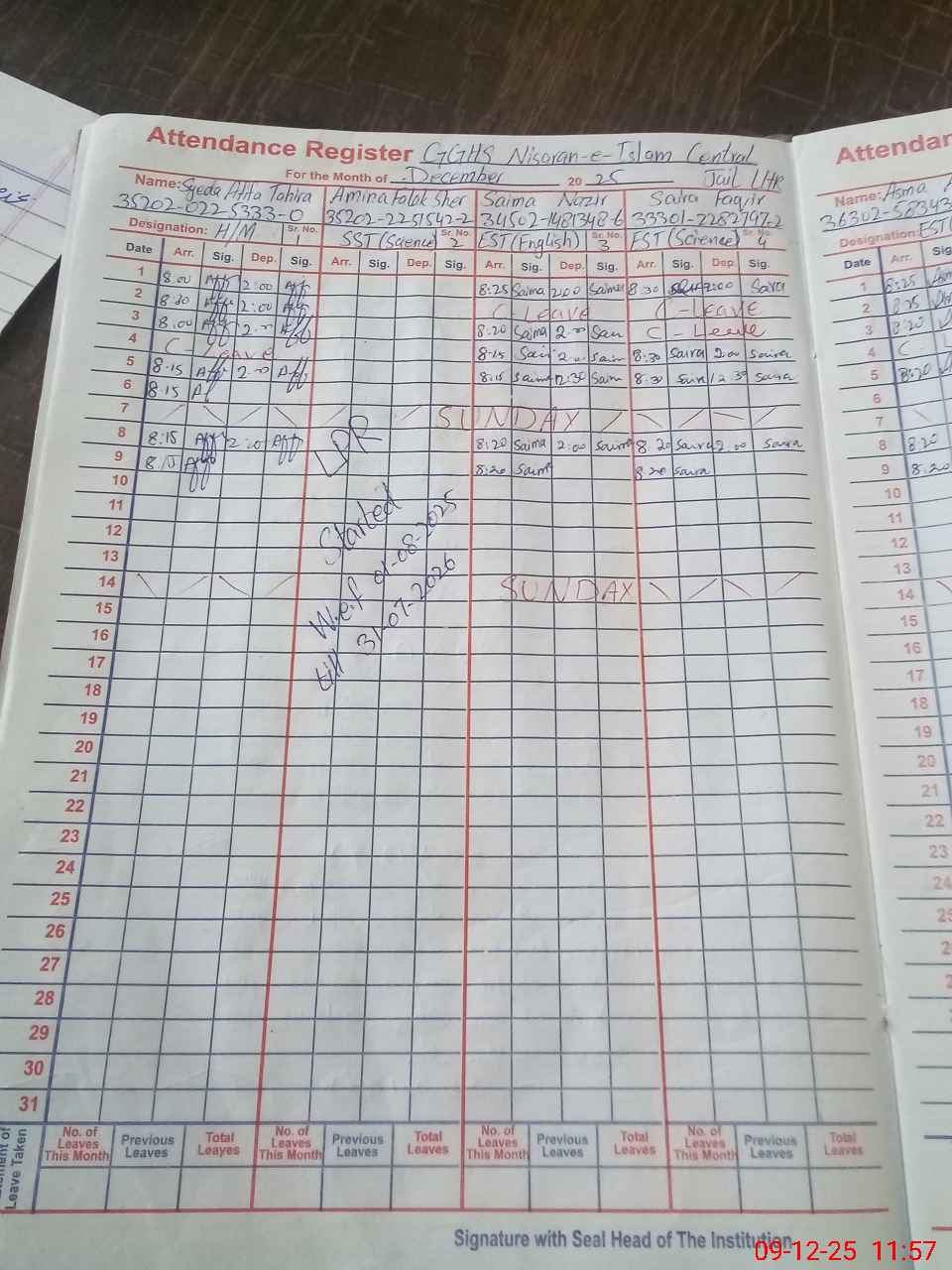 | CNIC | Full Name | Designation | R/C | Absence During Last Calender Month |