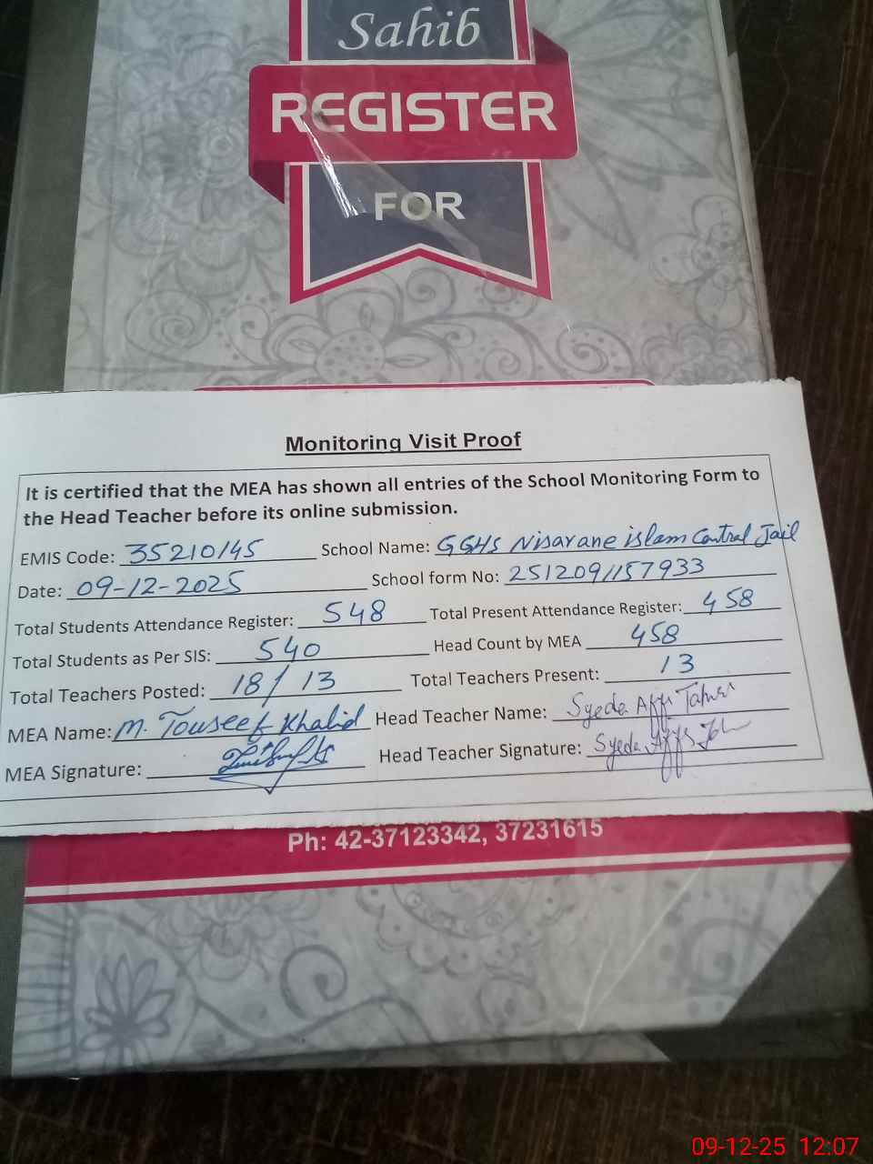 | Attendance Register | Head Teacher | MEA with School | Visit Proof |
