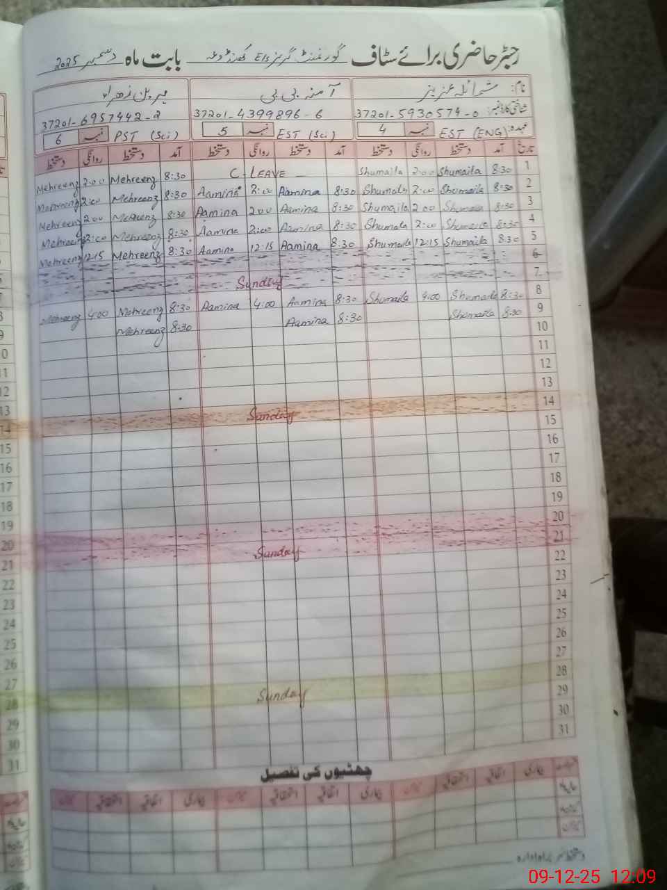 | CNIC | Full Name | Designation | R/C | Absence During Last Calender Month |