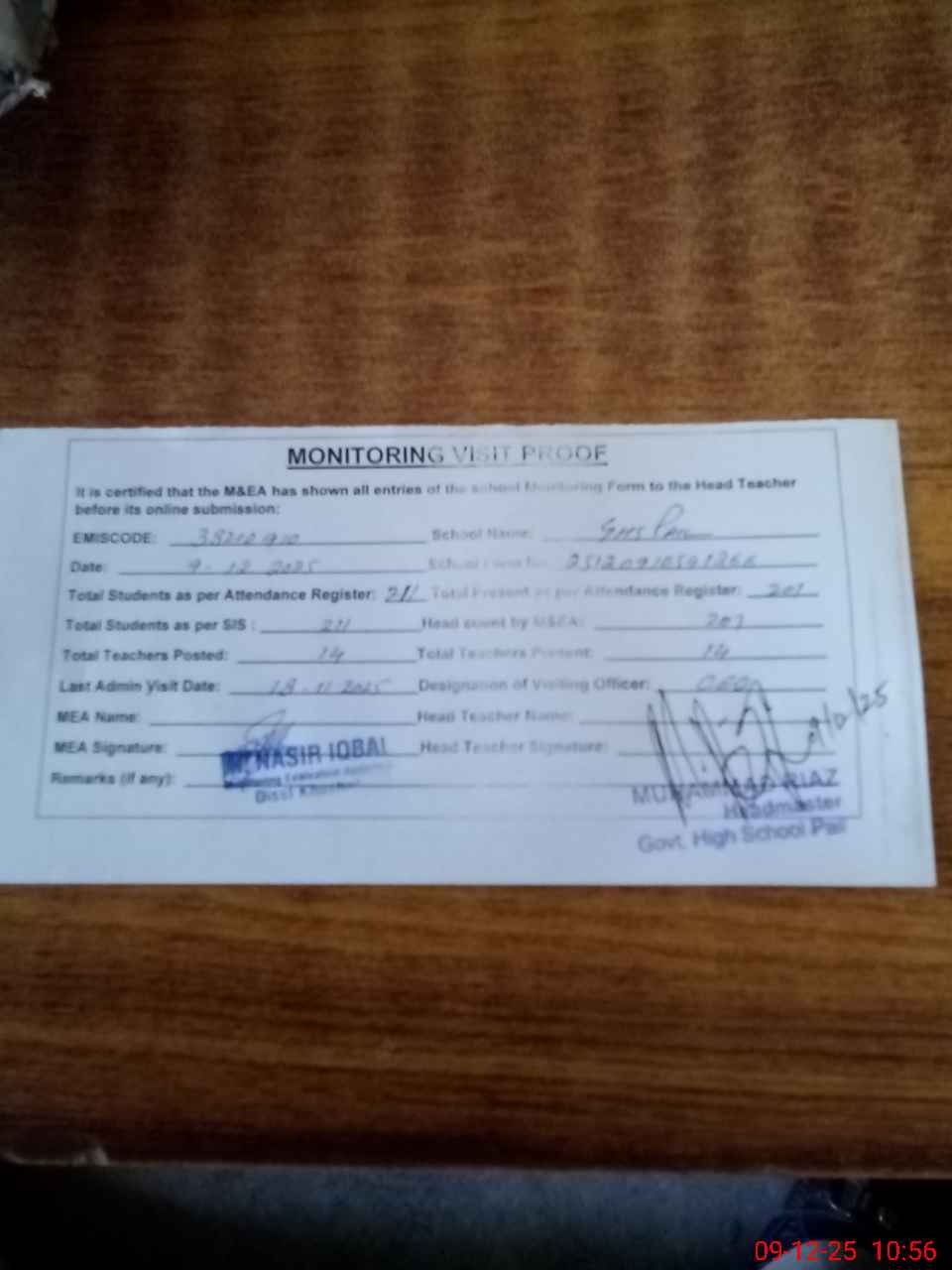 | Attendance Register | Head Teacher | MEA with School | Visit Proof |