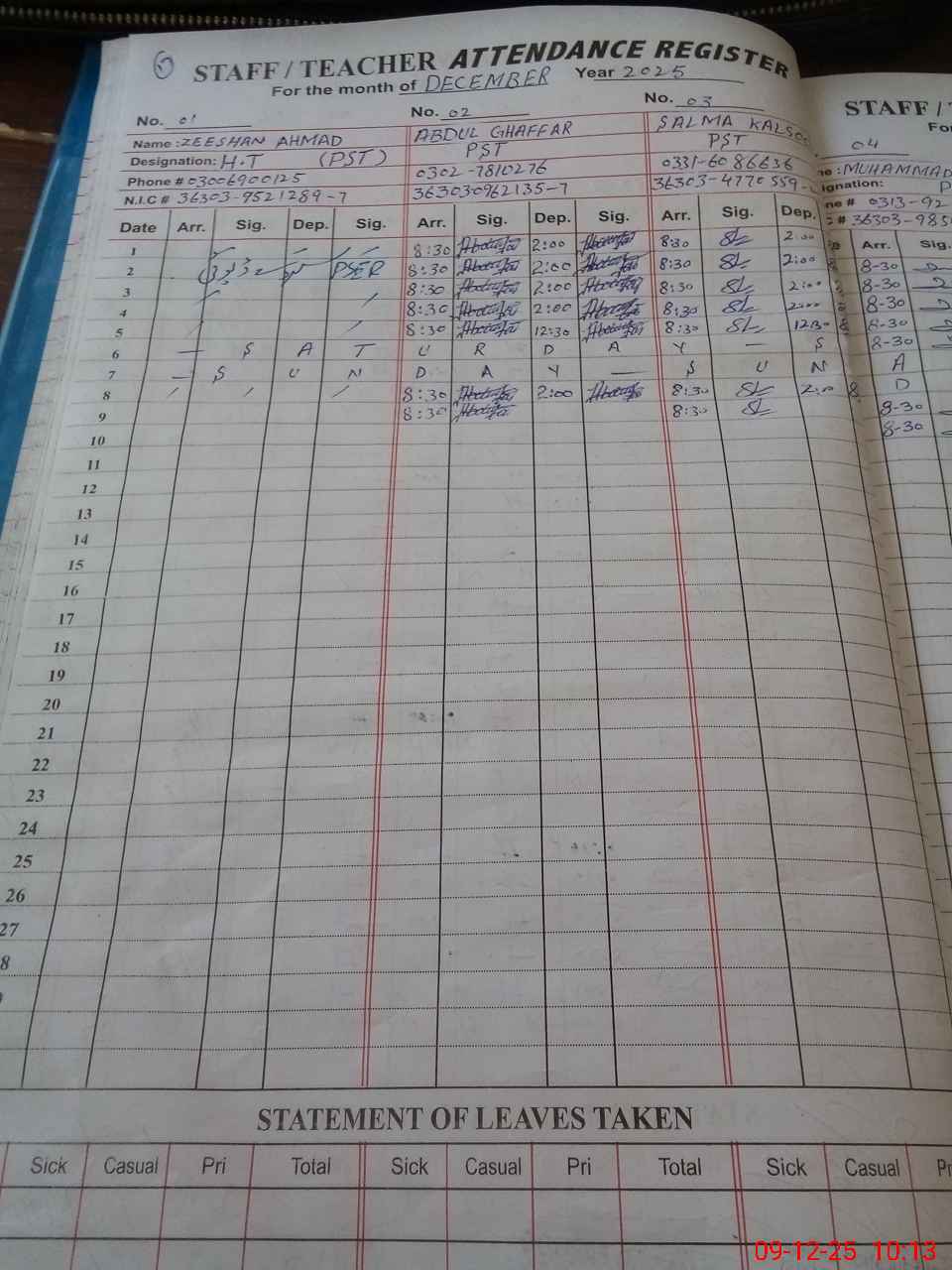 | CNIC | Full Name | Designation | R/C | Absence during last cal. month |