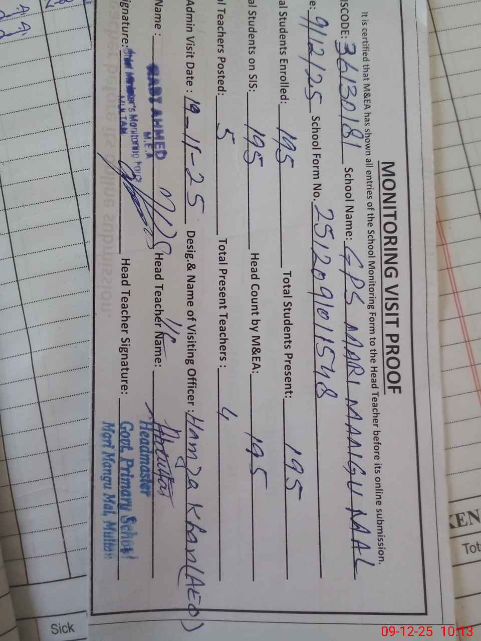 | Attendance Register | Head Teacher | MEA with School | Visit Proof |